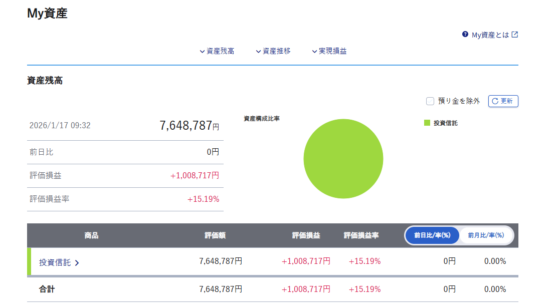 画像:僕の新NISA運用成績(SBI証券のマイページ画面) ※短期間の変動に一喜一憂せず、淡々と積み立てを続けた結果が数字として表れています。